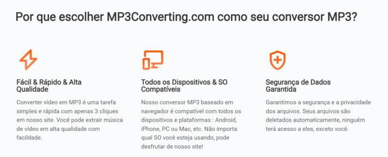 MP3Converting é a grande descoberta de 2022 quando se trata de transformar vídeo em MP3. Esta ferramenta incrivelmente bem desenhada permite converter qualquer vídeo em áudio, independentemente de seu tamanho ou formato. O melhor de tudo, ele o faz com velocidade surpreendente, mantendo a qualidade de áudio original do vídeo. Outro ponto positivo é que suas configurações de segurança lhe darão a paz de espírito que você deseja ao usar ferramentas online.
