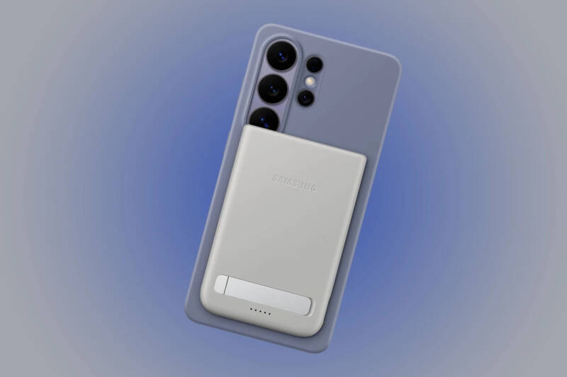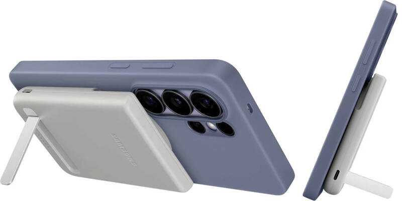 A Samsung incorporou um suporte dobrável na parte traseira do acessório, transformando-o em um verdadeiro estande multimídia. Quando acoplado magneticamente ao celular, permite assistir a vídeos ou realizar videochamadas sem a necessidade de um suporte adicional, unindo utilidade e praticidade.