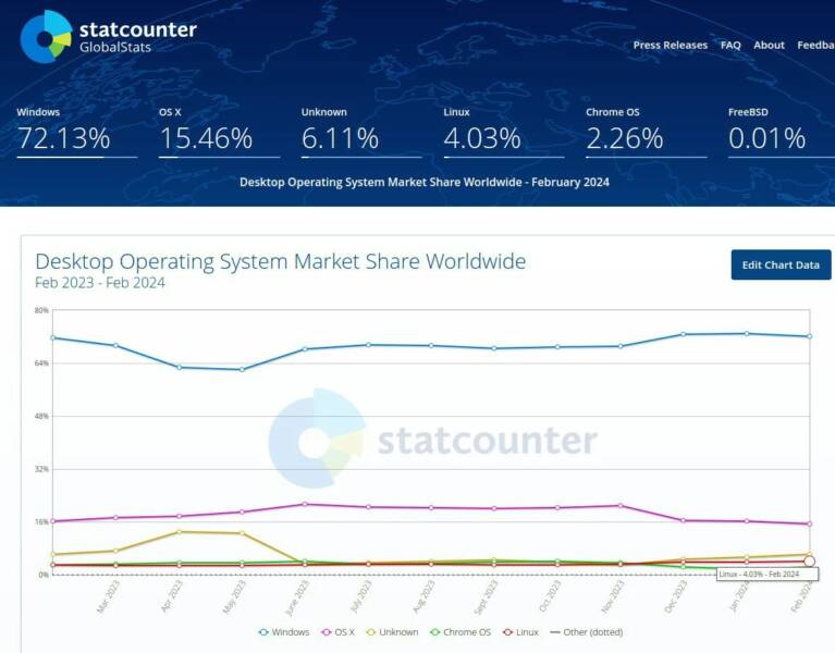 Em fevereiro de 2024, o sistema operacional de código aberto ultrapassou a marca de 4% de participação de mercado no segmento de desktops, de acordo com dados da StatCounter. E isso é um sinal claro de que o ano tem tudo para ser muito promissor para o Linux.