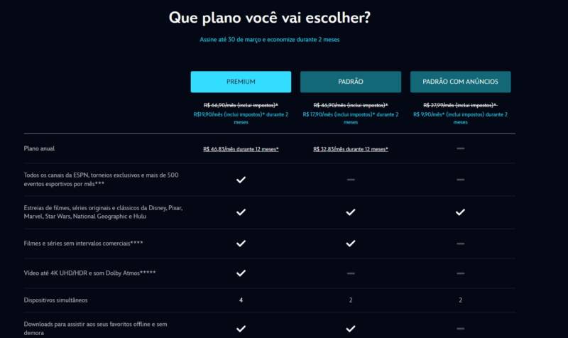 Já os assinantes que preferem uma experiência sem interrupções e com mais recursos podem optar pelo Plano Padrão (sem anúncios) por R$ 17,90 ou pelo Plano Premium por R$ 19,90 ao mês. O plano Premium é o único que garante imagem em 4K, som Dolby Atmos, quatro telas simultâneas e, como grande diferencial, acesso a todo o conteúdo da ESPN, incluindo transmissões esportivas ao vivo.